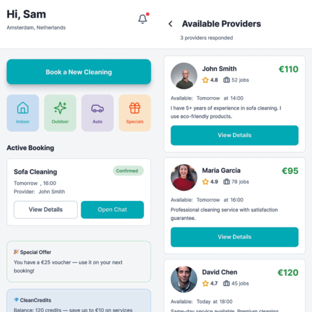 Je kiest een dienst, uploadt foto’s en ziet direct een vaste prijs. Daarna kies je zelf een geverifieerde professional die bij jou langskomt op het moment dat jij wilt.